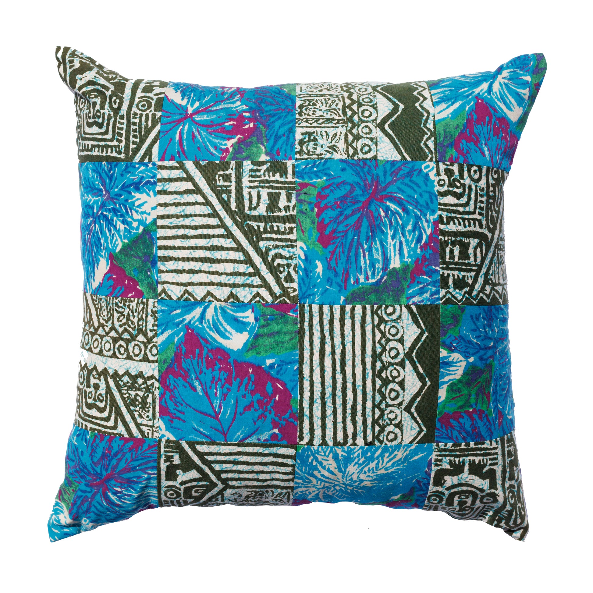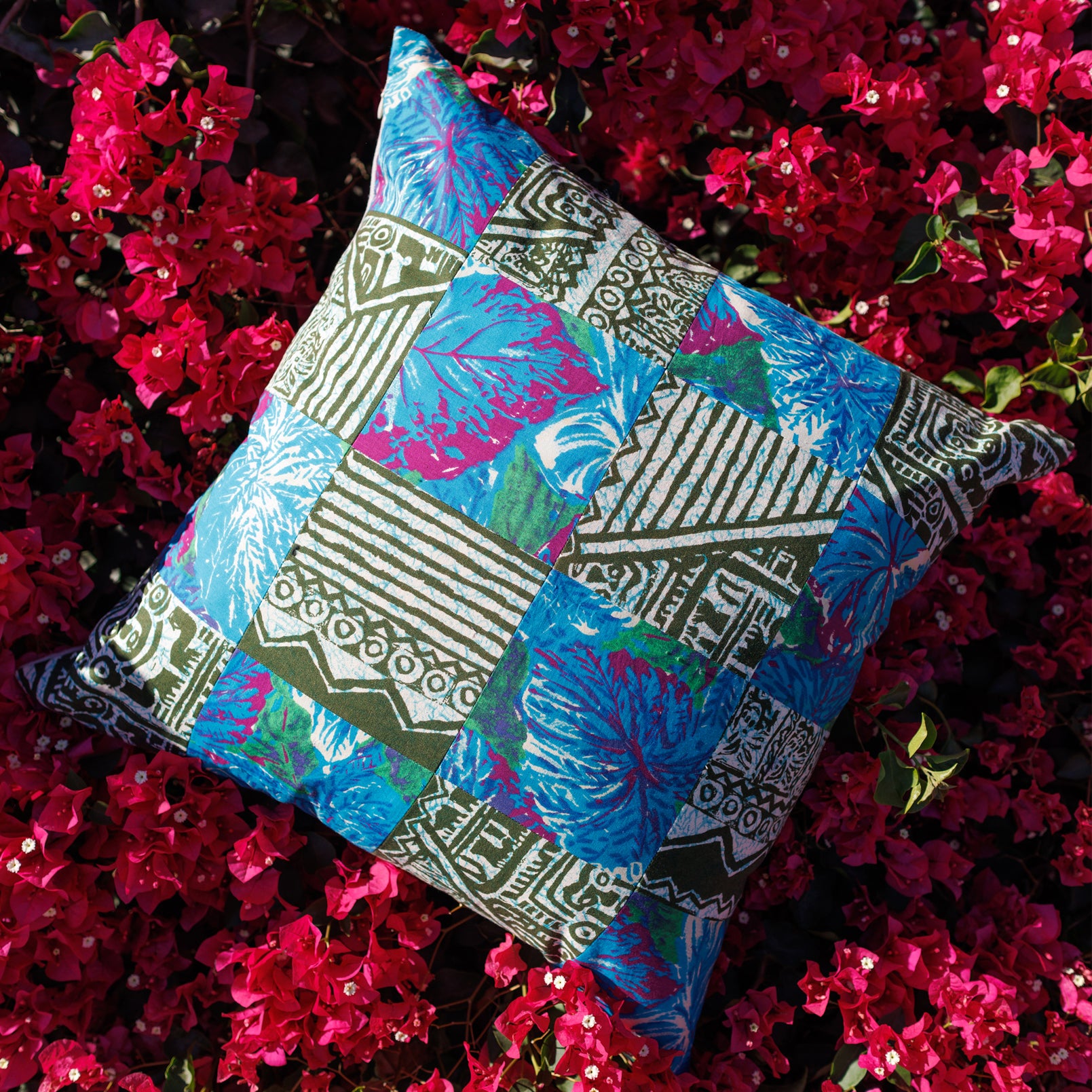 This one-of-a-kind patchwork assemblage pillow was created using vintage fabric remnants and is backed with 100% hemp fabric.