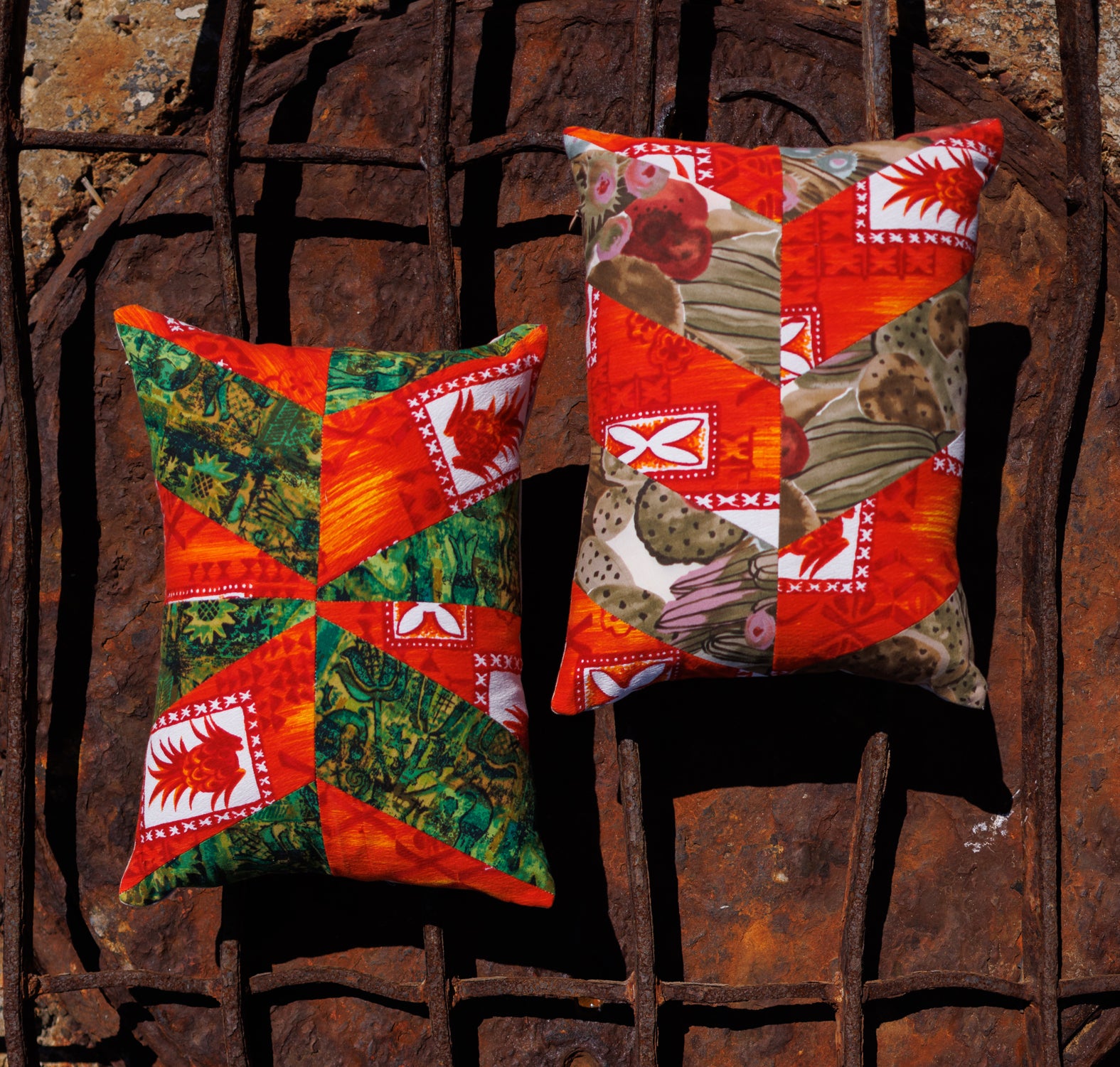 This one-of-a-kind patchwork assemblage pillow was created using vintage fabric remnants and is backed with 100% hemp fabric.