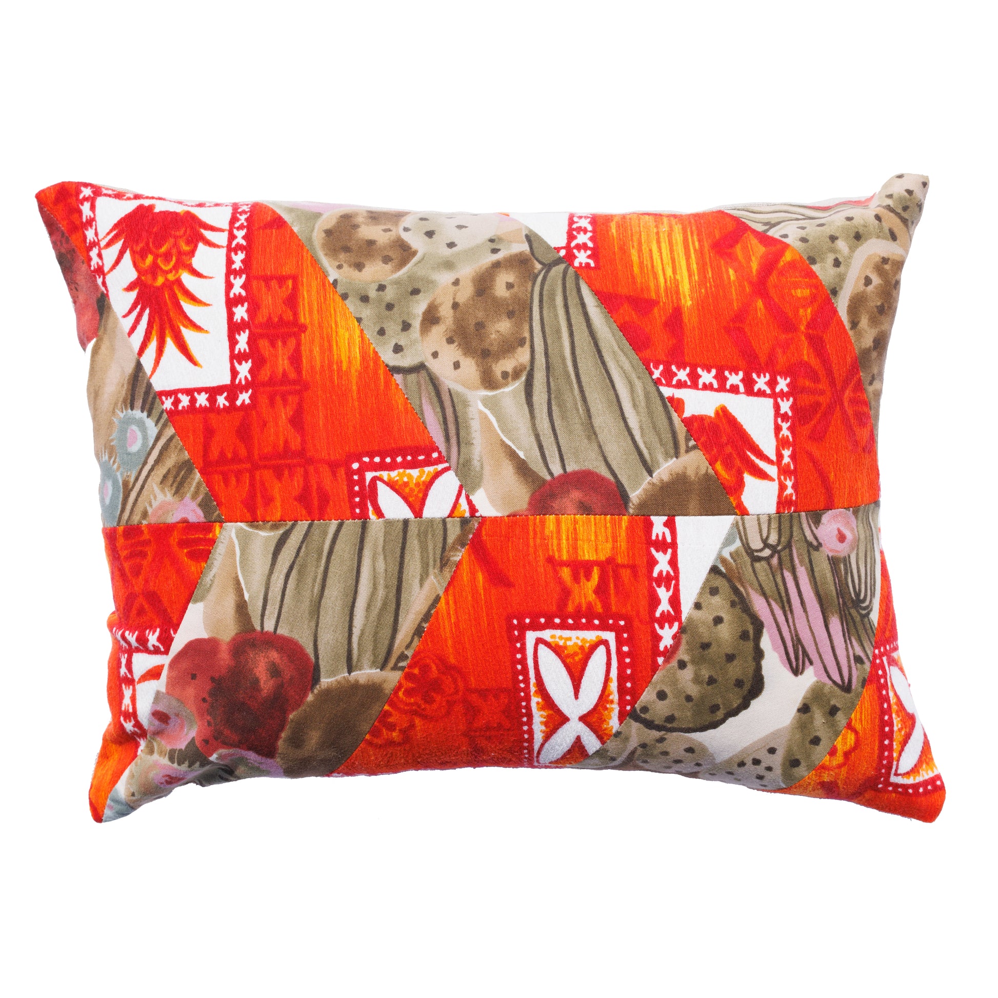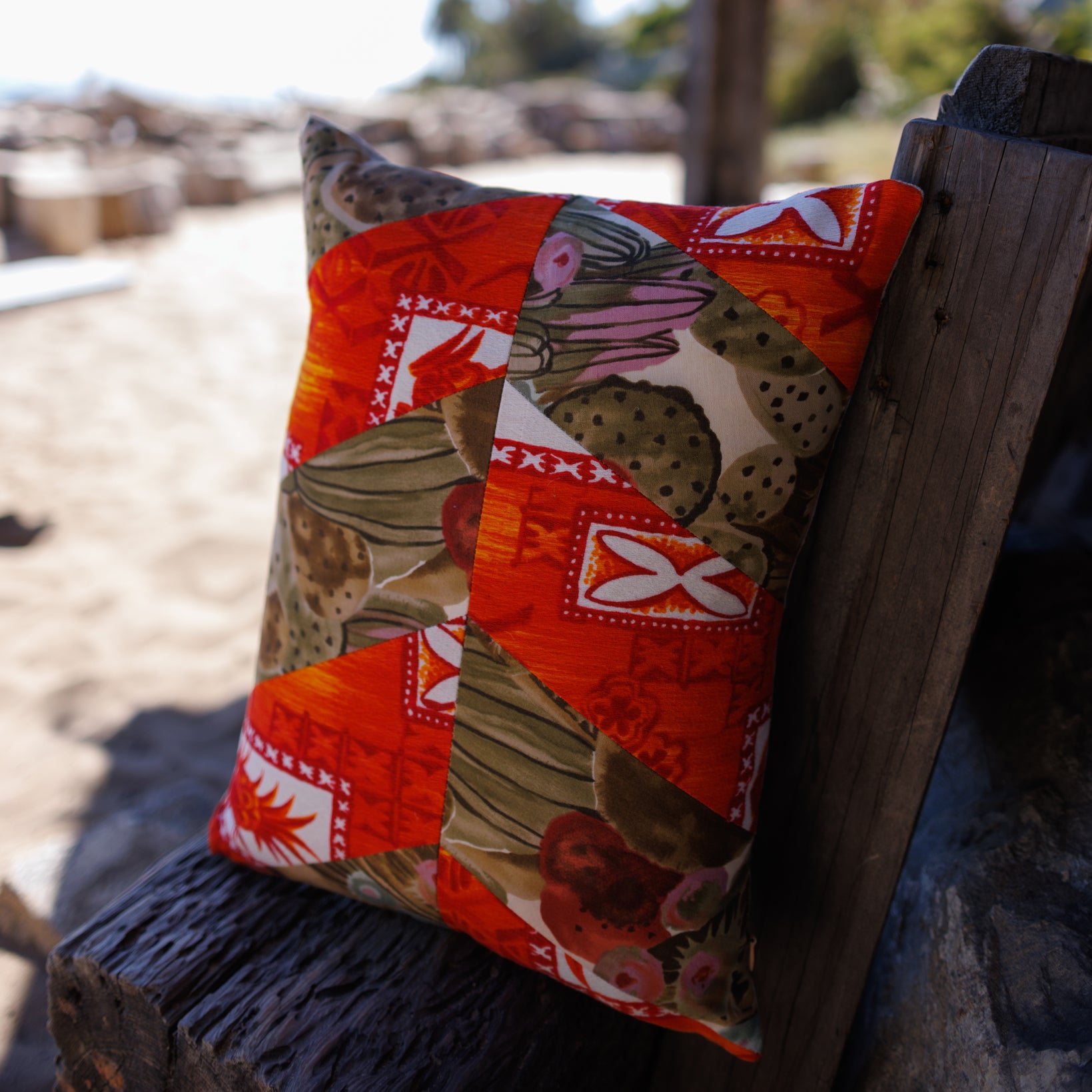This one-of-a-kind patchwork assemblage pillow was created using vintage fabric remnants and is backed with 100% hemp fabric.