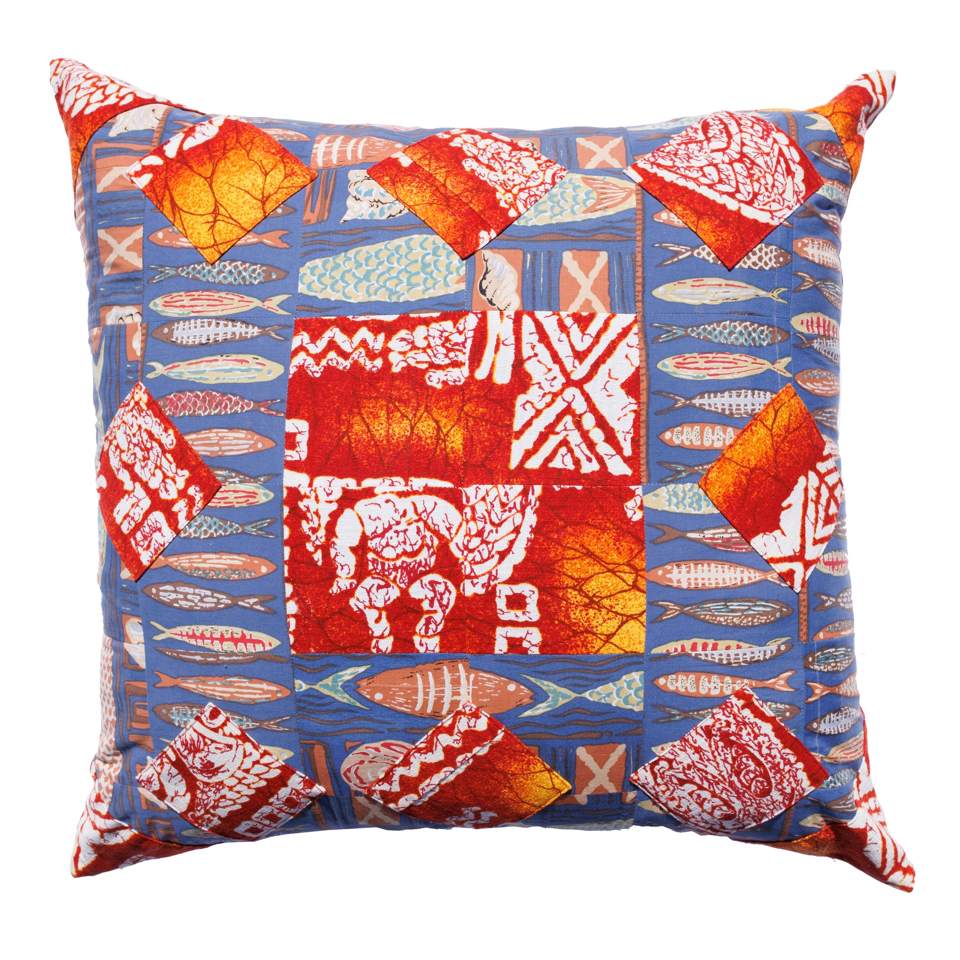 This one-of-a-kind patchwork assemblage pillow was created using vintage fabric remnants and is backed with 100% hemp fabric.