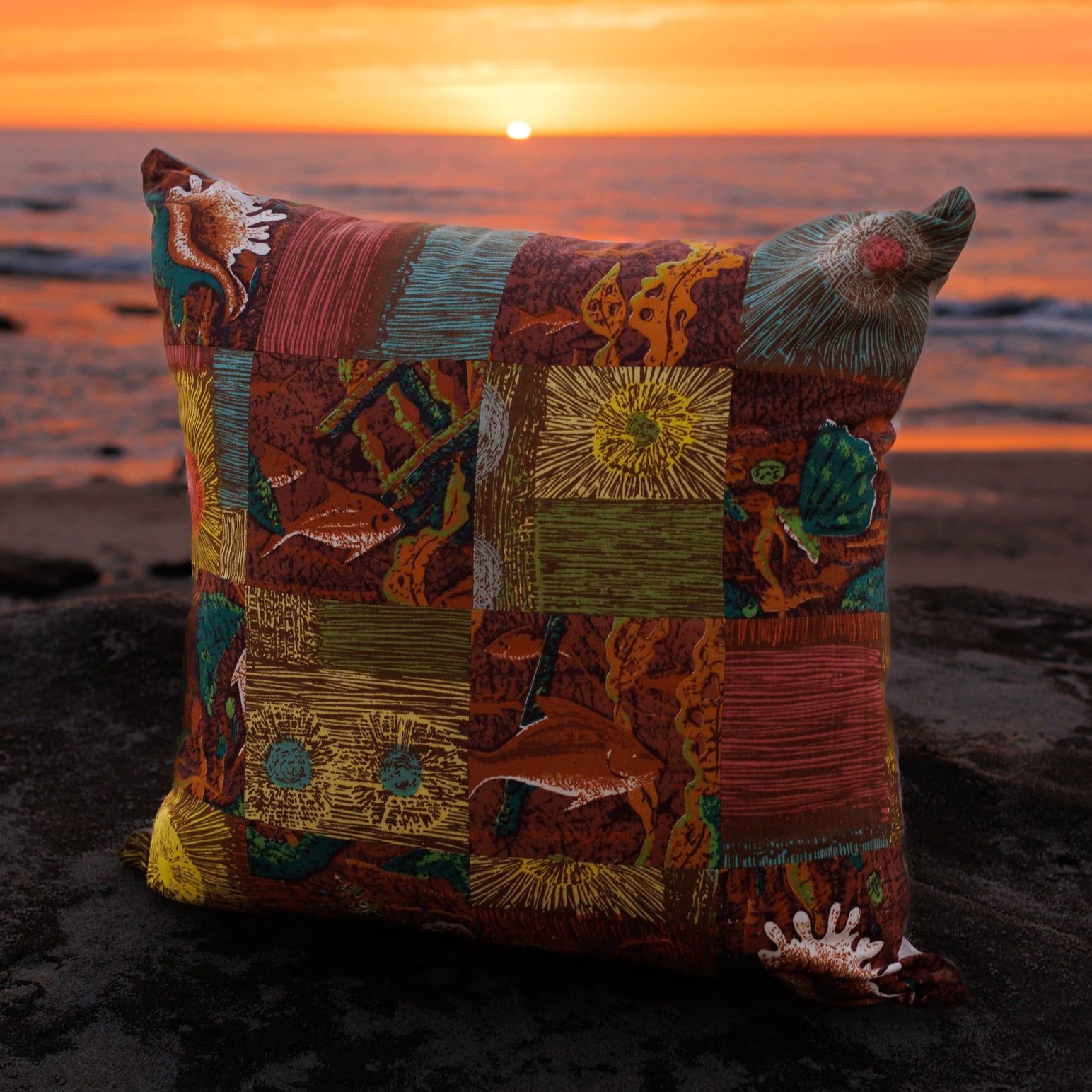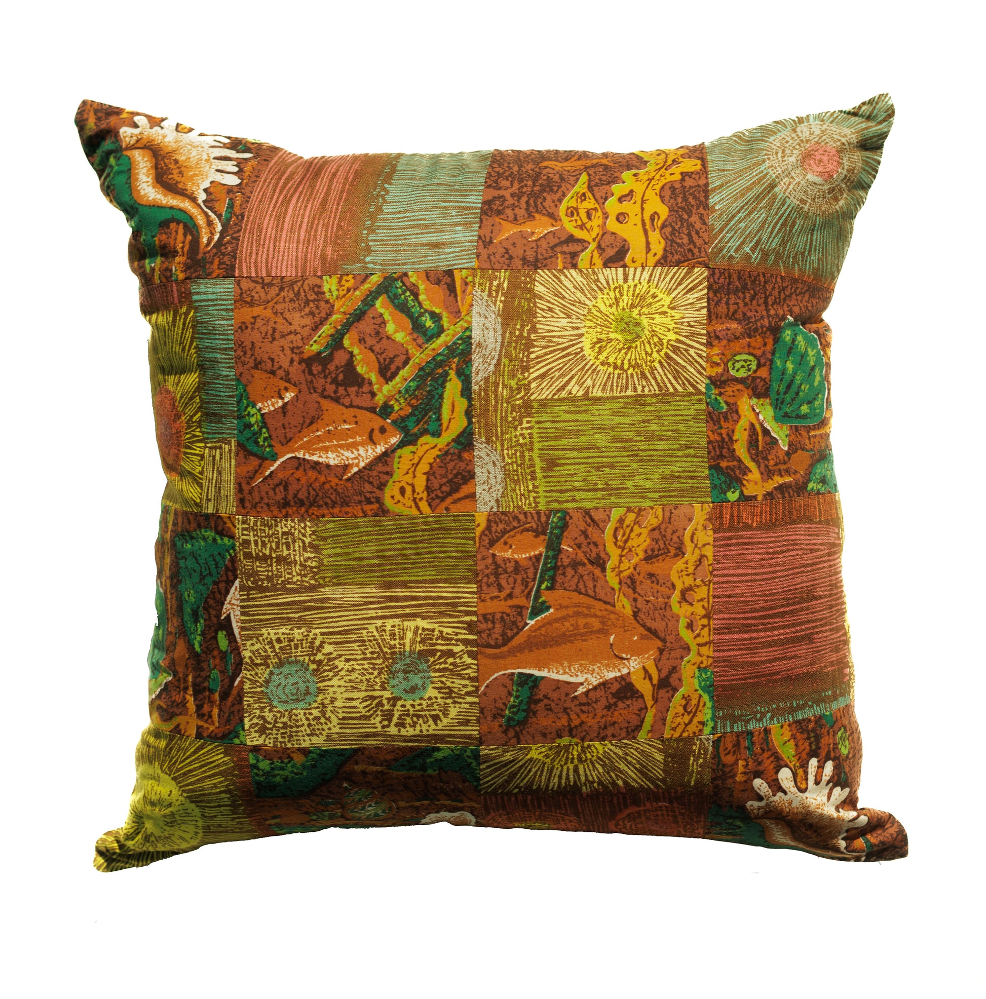 This one-of-a-kind patchwork assemblage pillow was created using vintage fabric remnants and is backed with 100% hemp fabric.